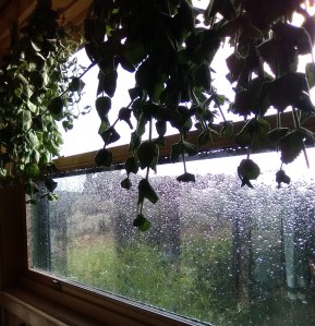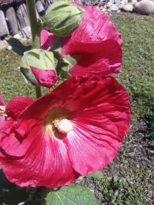 Last week I noticed a new volunteer hollyhock, not two feet tall, blooming a brilliant red. Another gift to be grateful for until the frost takes it away.
